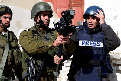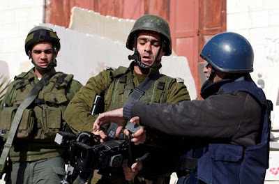 HEB12. BELÉN (CISJORDANIA), 02/01/09.- Un soldado israelí observa la cámara del periodista de Reuters Yusri al-Jamal durante una protesta realizada por palestinos. El fotógrafo de la agencia de noticias Reuters, Yusri al-Jamal, se queja ante unos soldados israelíes que le han tirado la cámara al suelo mientras cubría una protesta realizada por palestinos por los ataques en Gaza, en el pueblo de al-Masara, cerca de Belén, el 2 de enero de 2009. Hamás ha declarado el 2 de enero como “día de furia” tras el asesinato de Nizar Rayan, destacado líder de Hamás. EFE/Abed Al Hafiz Hashlamoun.